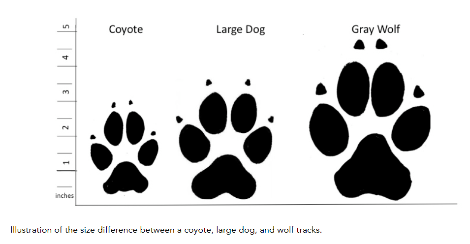 Image source: Coyote Tracks and Prints and How to Recognize Them, via https://floofmania.com/coyotes/coyote-tracks/. Original graphic credit goes to Illinois Department of Natural Resources and the National Great Rivers Research and Education Center.