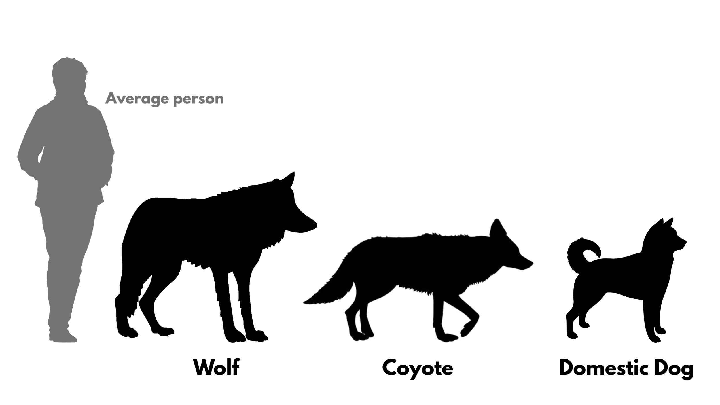 Silhouette comparison of each canine, in proportion to each other. Domestic dogs can vary significantly in size, depending on breed.