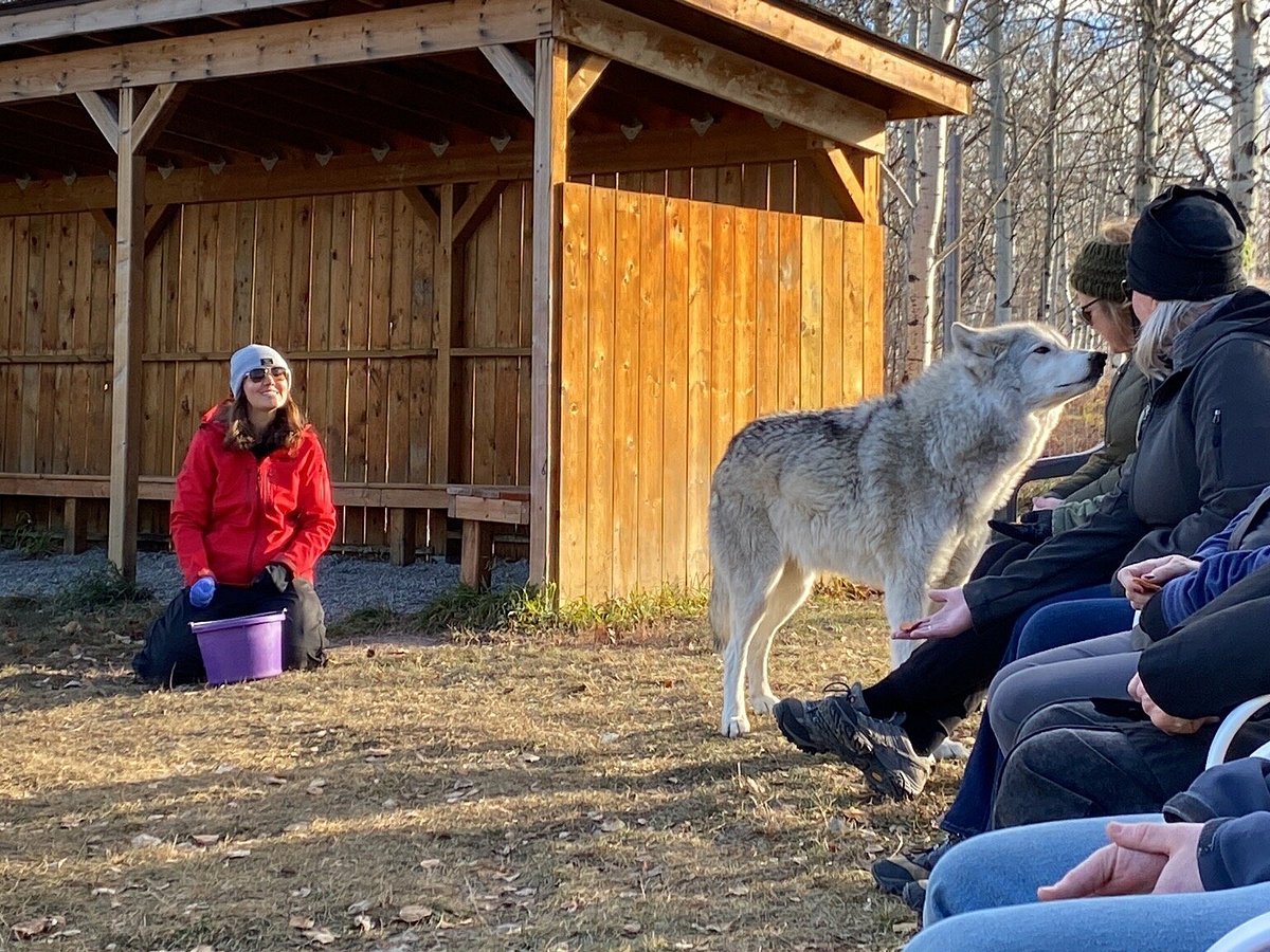 Visitors interact with a wolfdog at Yamnuska Wolfdog Sanctuary during one of their interactive tours. Image Credit: Tripadvisor