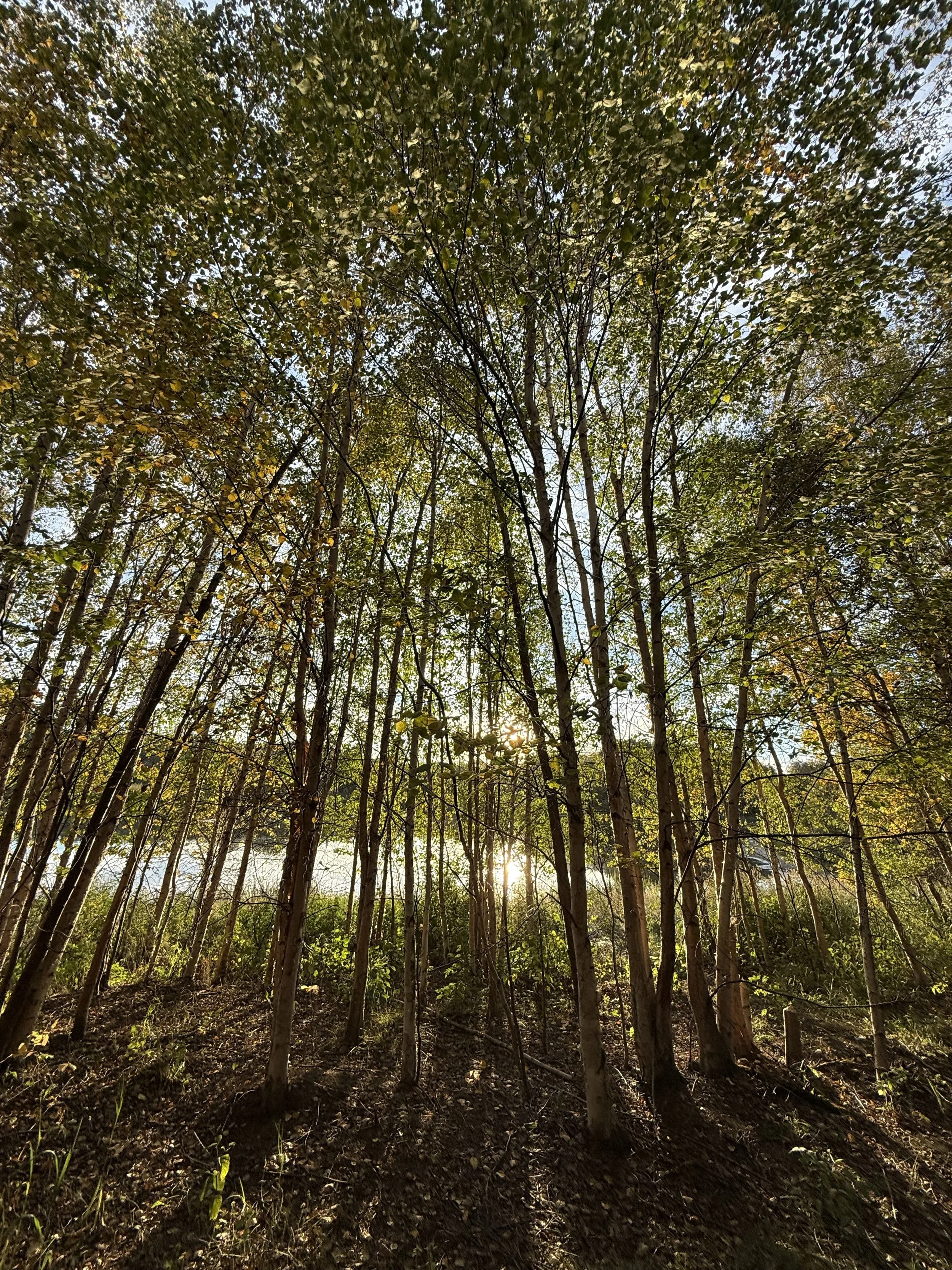 Birch trees near sunset at maskihkîy meskanaw. Photo by Brett Bolkowy.